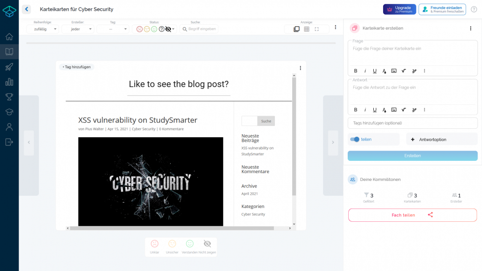 To show that data from other websites can also be retrieved and injected into the StudySmarter source code, in the following example this blog post has been embedded into the solution of the flashcard through incorrect HTML sanitisation.